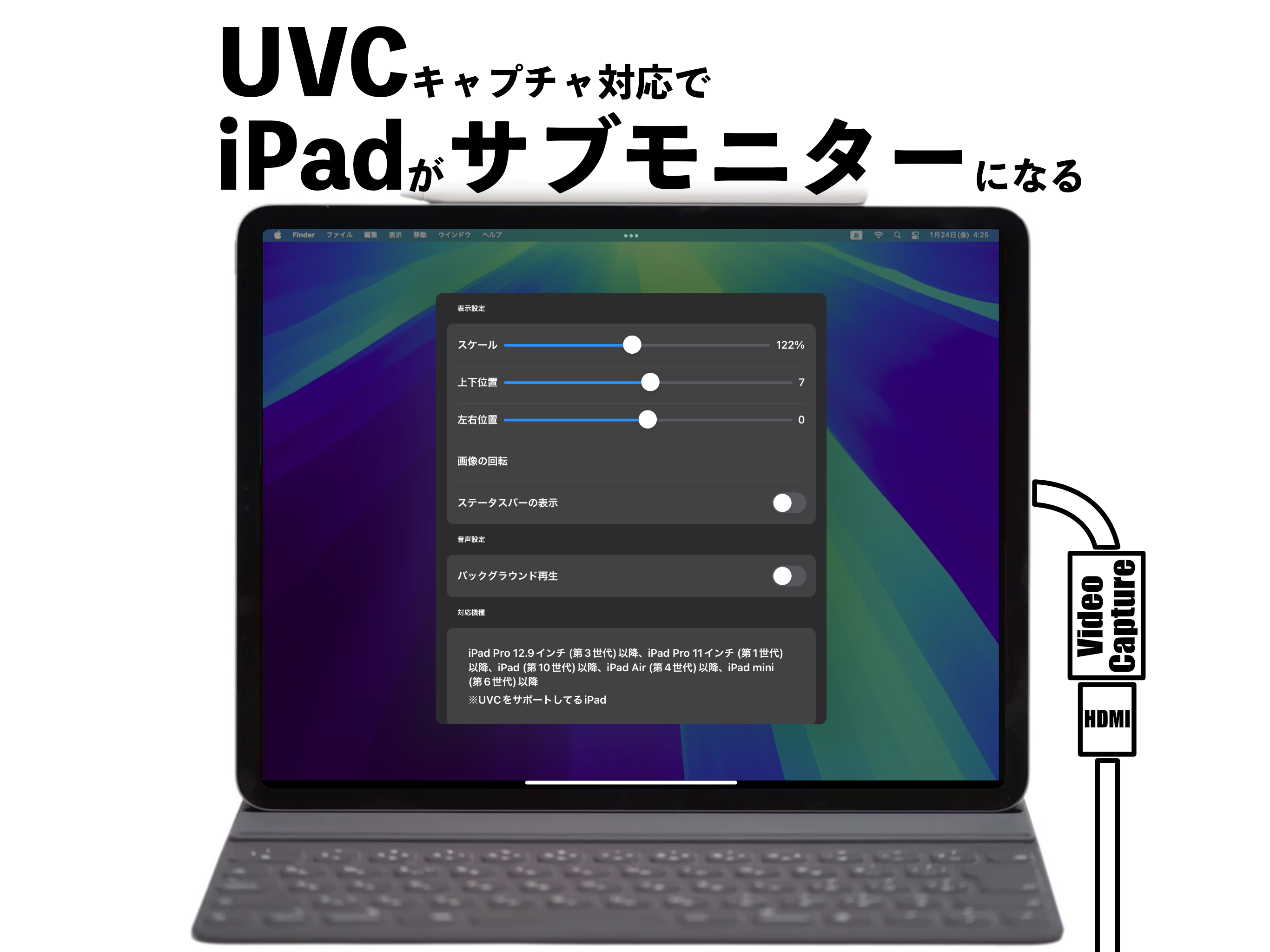 UVC対応機器の映像をiPadで表示できるモニターアプリです。外部映像を手元で確認したいときに使えます。