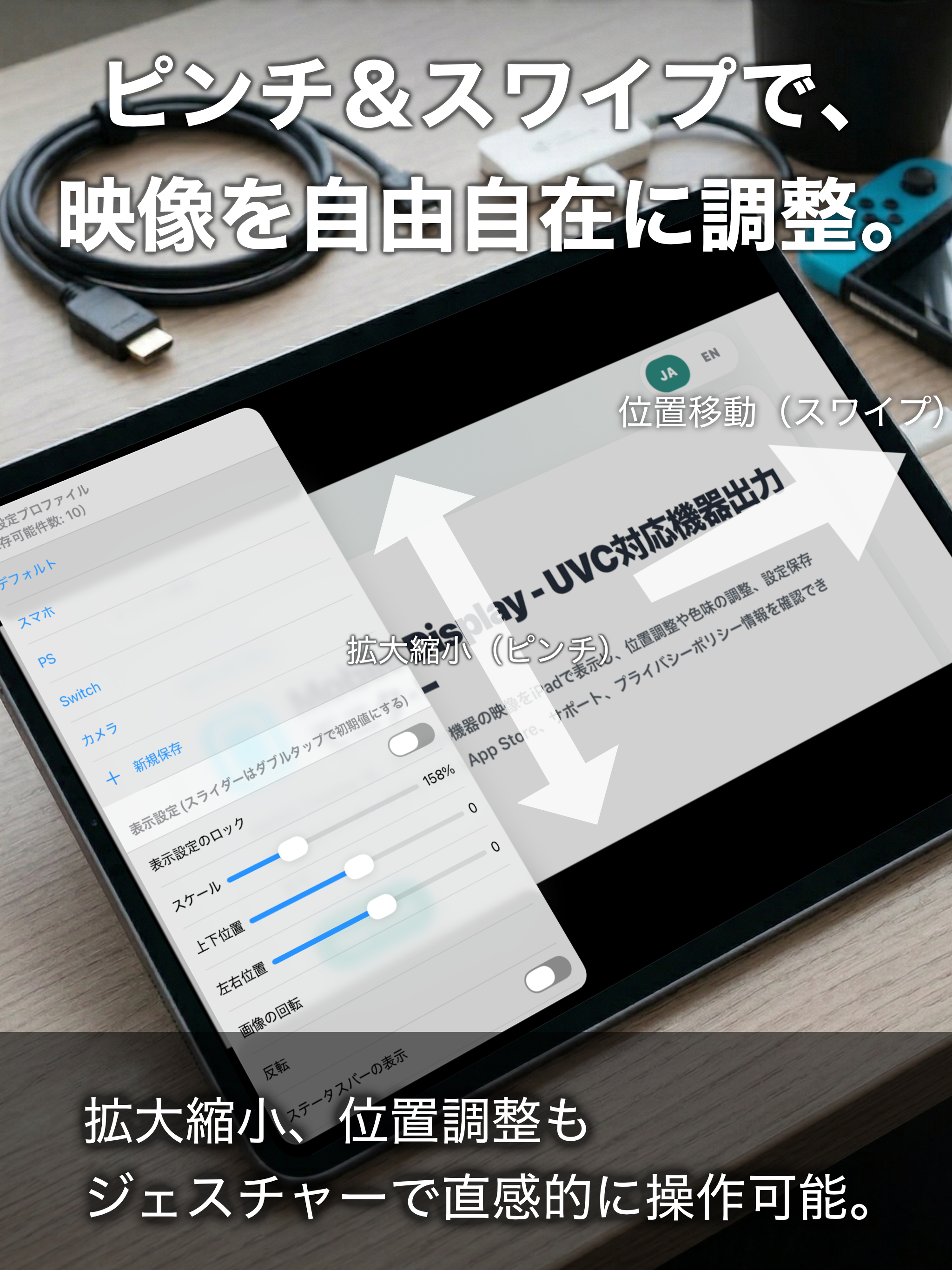 Mobile Display is a powerful app that transforms your iPad into a professional HDMI monitor using a UVC capture card. Simply connect a Nintendo Switch, DSLR camera, or PC to instantly view high-quality, low-latency video. It offers intuitive pinch-and-swipe gestures for zooming and positioning, plus advanced settings for color adjustment, rotation, and flipping. Save your favorite configurations as custom profiles and use the screen lock feature to prevent accidental touches. Perfect for game streaming, external camera monitoring, or live broadcast previews, it lets you seamlessly utilize your iPad's stunning display as the ultimate external monitor in any situation.