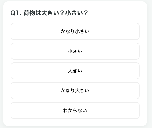 従来の配送比較サイトは、一覧表から自分で選ぶ形式が多く、初心者にはハードルが高いのが現状です。本構想では「送りたいものは封筒に入りますか?」「厚さは3cm以内ですか?」といった一問一答のステップを踏むことで、専門知識がなくても最短ルートで最安値に辿り着けるUIを目指しています。